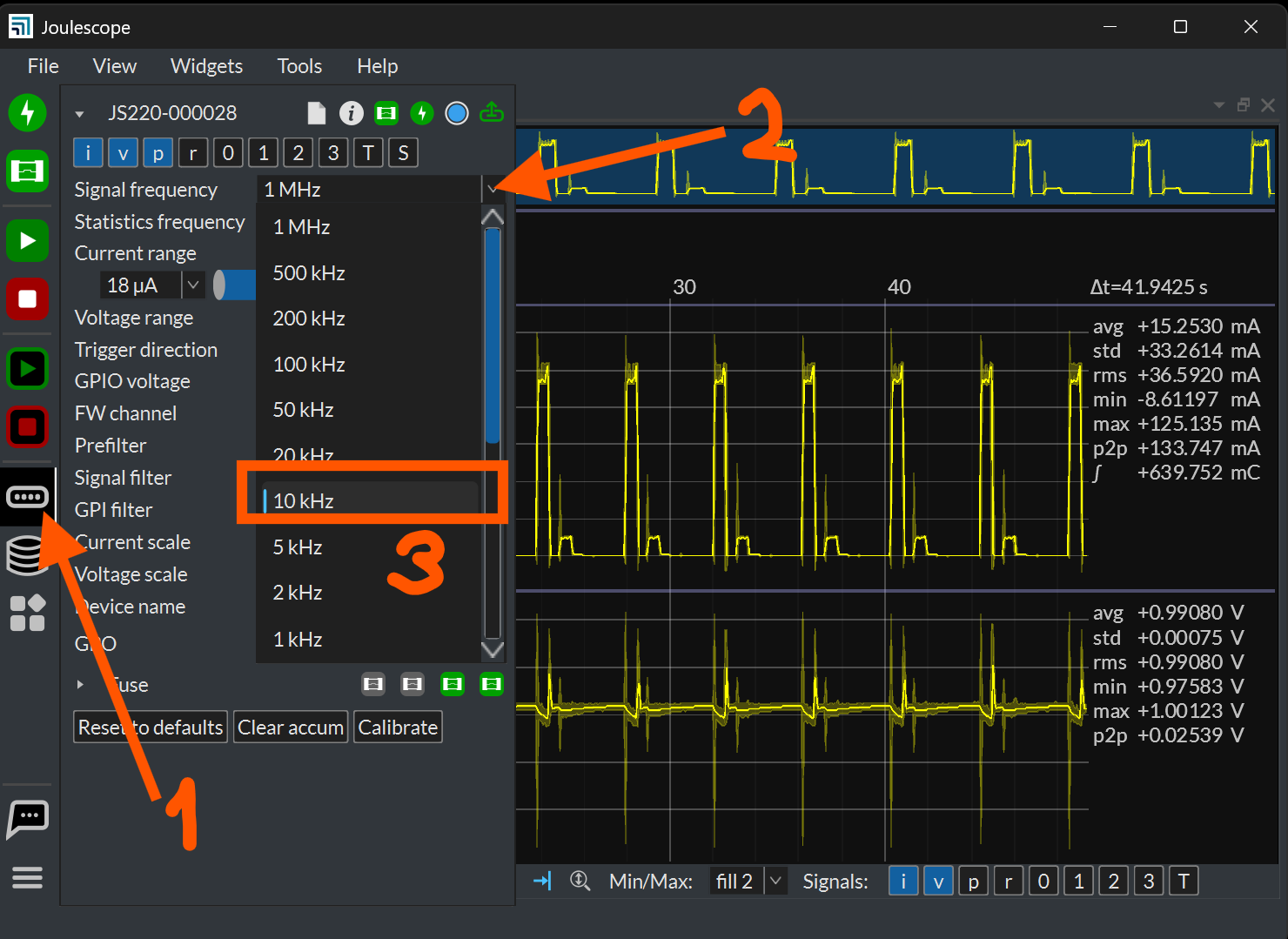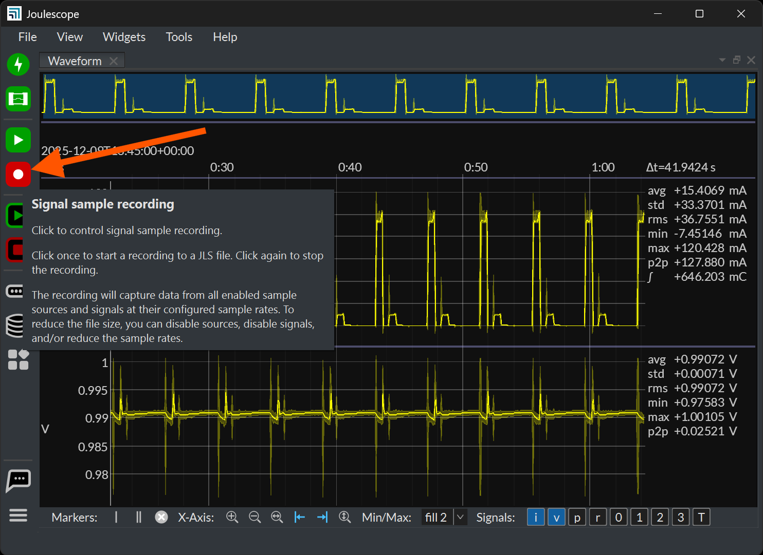 The Joulescope UI gives you three choices for displaying data captured over longer durations.