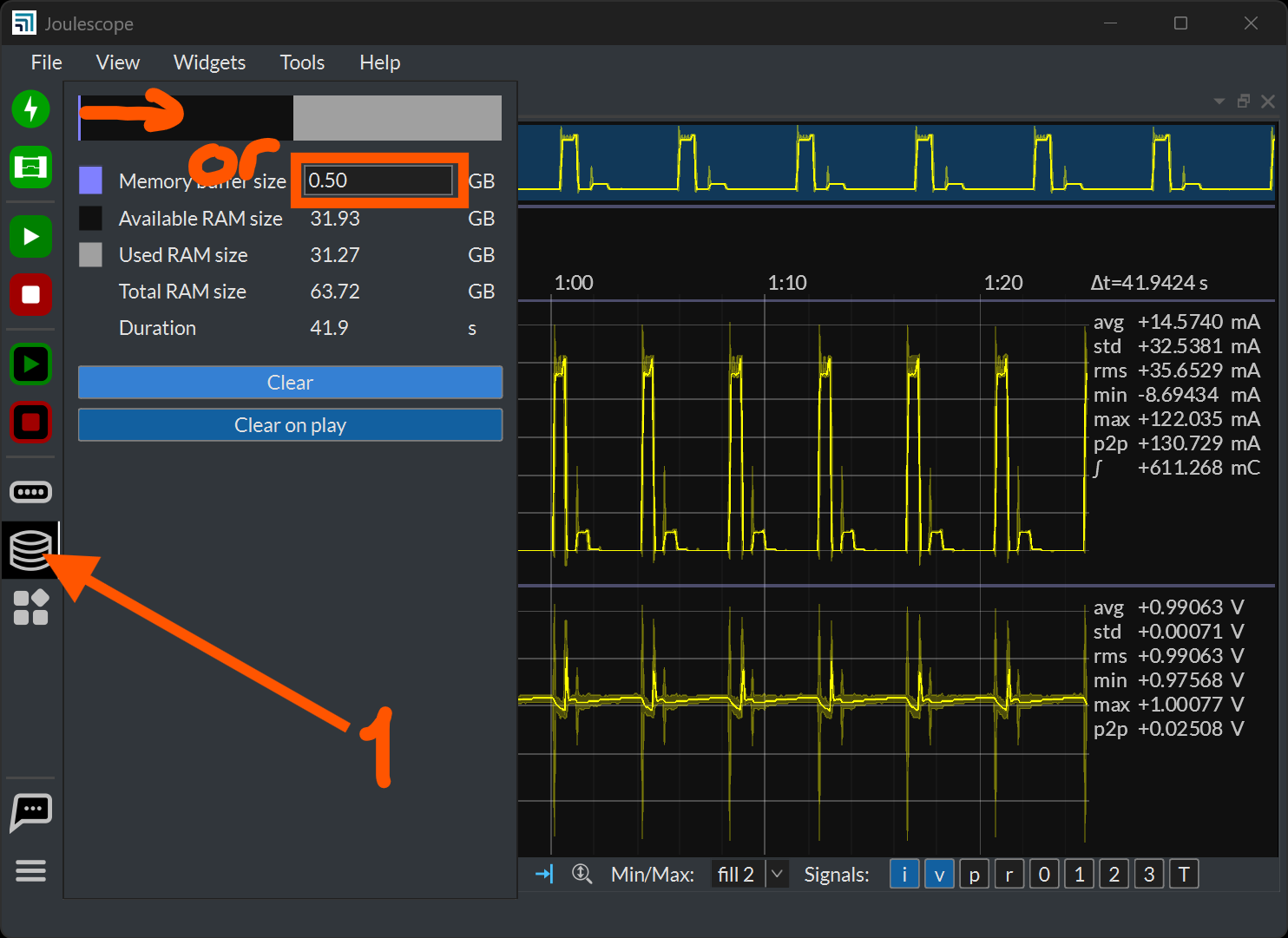The live streaming feature of the Joulescope UI uses your host computer’s RAM to store the data. At full rate, a single Joulescope produces about 12 MB/s for current, voltage, and power. With the default RAM buffer setting of 0.5 GB, this limits the buffer to about 42 seconds. You can increase this if your computer has more RAM: